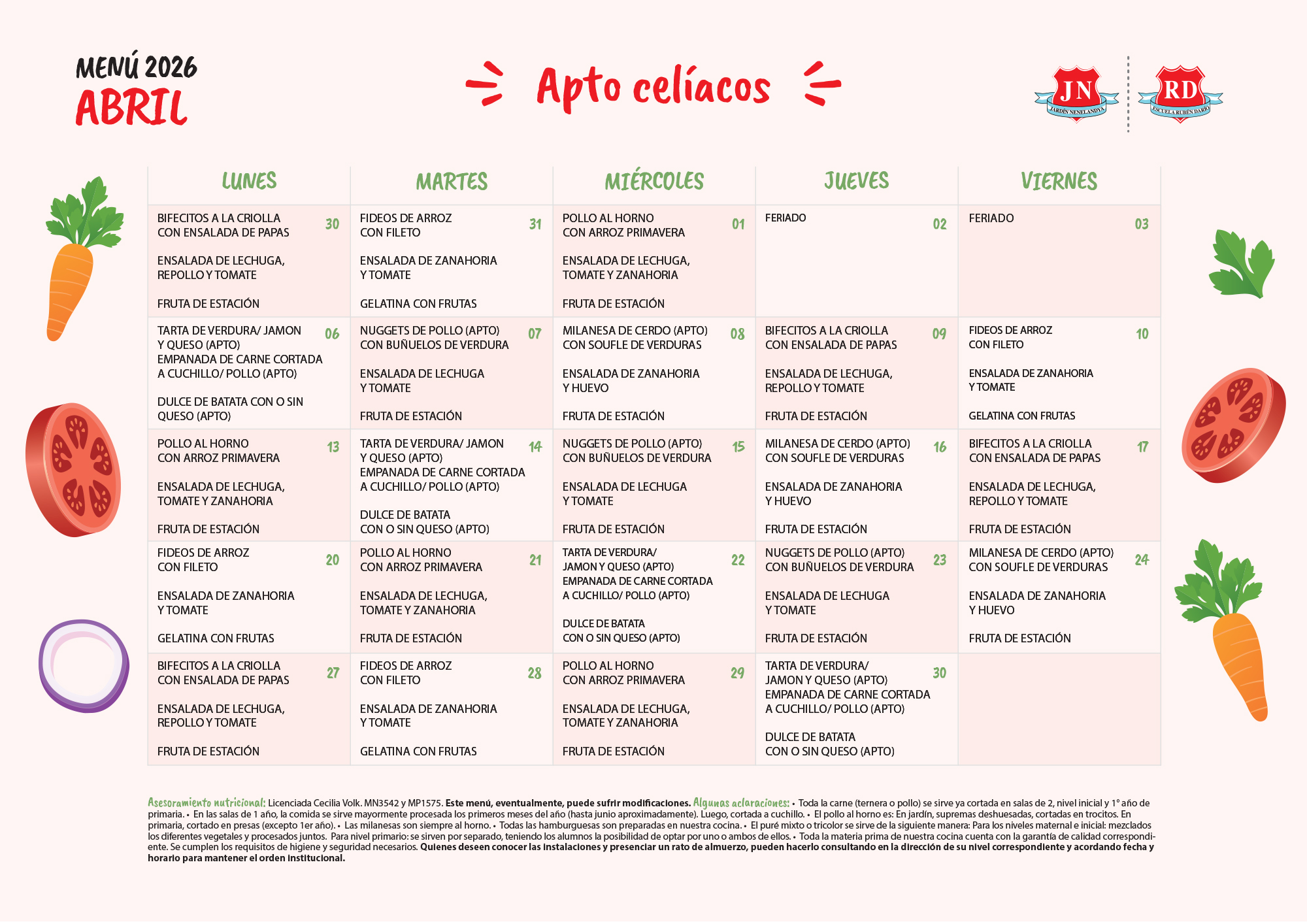El menú escolar es cuidadosamente elaborado por nuestra Licenciada en Nutrición, quien se asegura de que cada propuesta gastronómica cumpla con los requerimientos nutricionales adecuados para la edad y las necesidades específicas de nuestros estudiantes. Además, se priorizan ingredientes frescos, variados y de calidad, con atención especial a la inclusión de alimentos que favorezcan una dieta equilibrada y el cuidado del bienestar general.